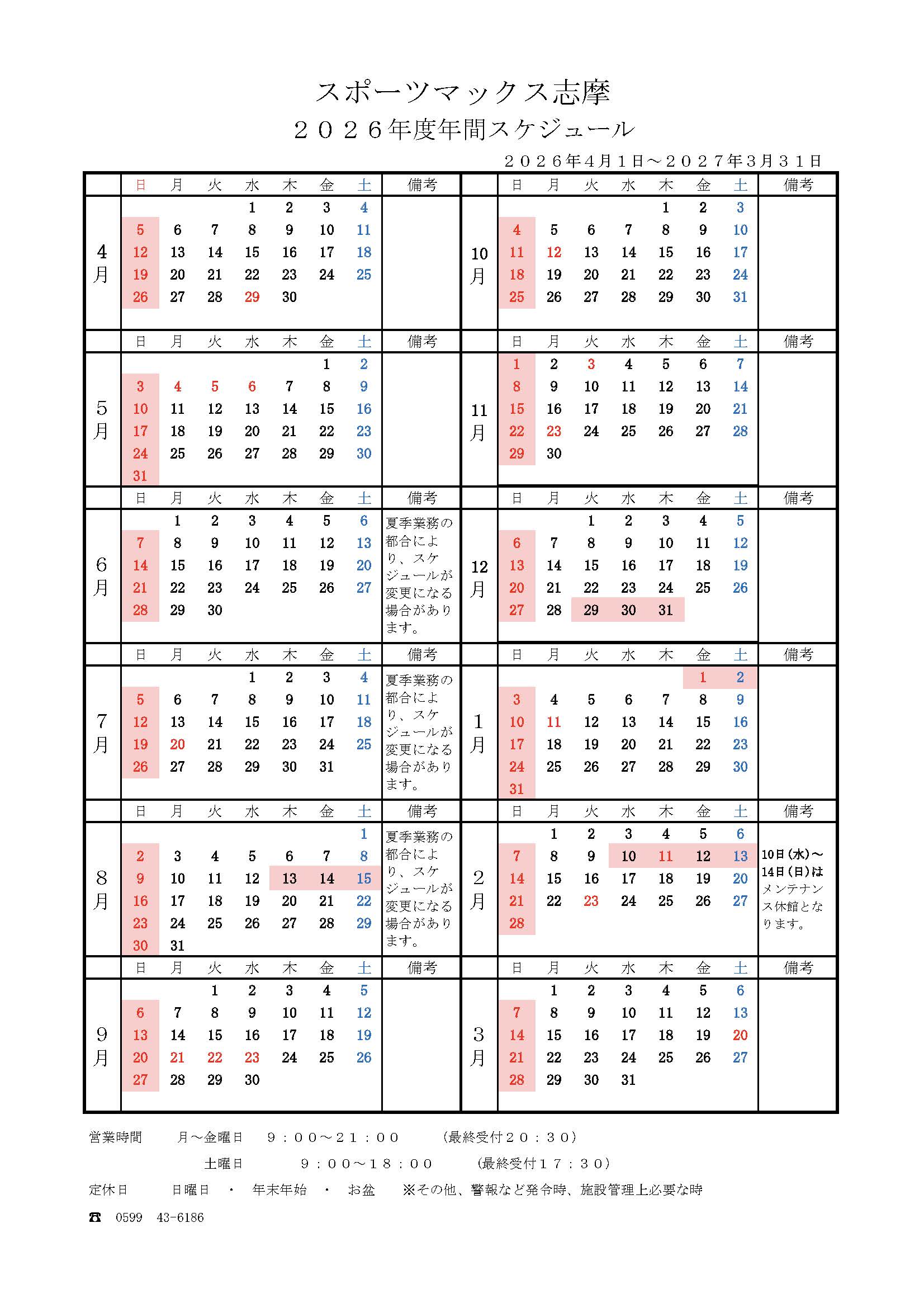 日曜日 お盆休み・年末年始 |